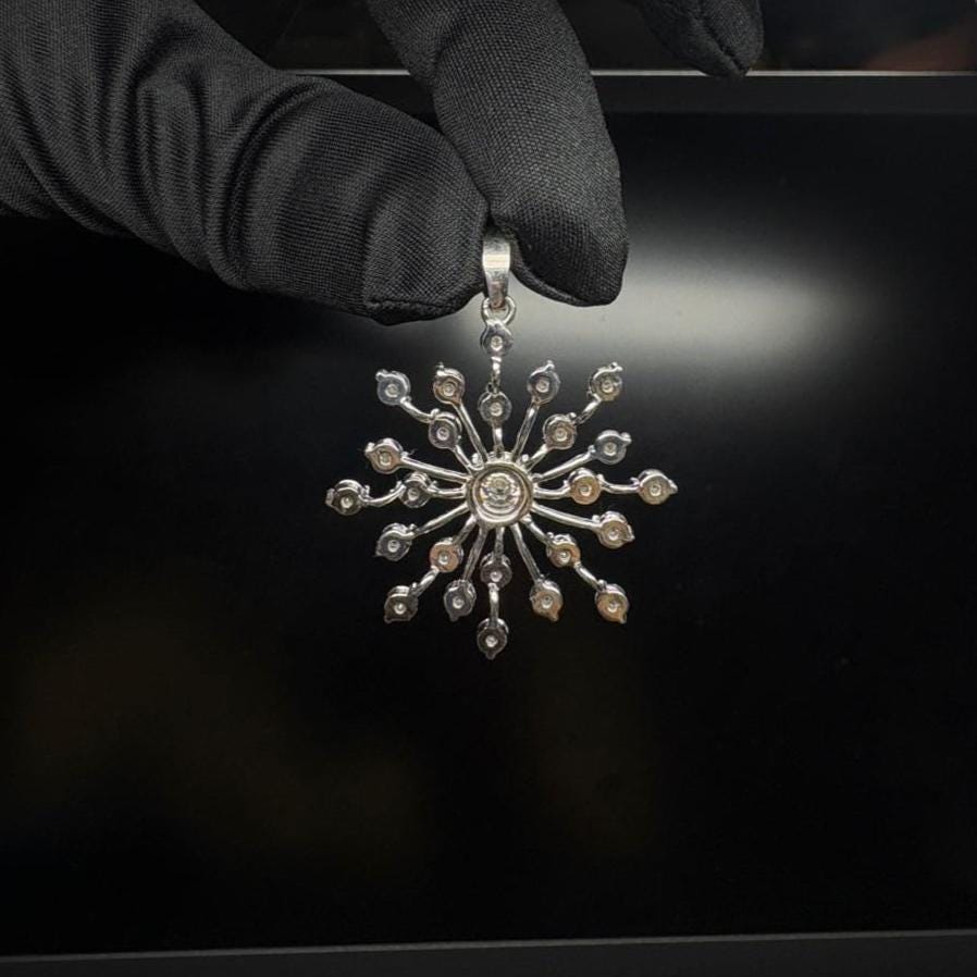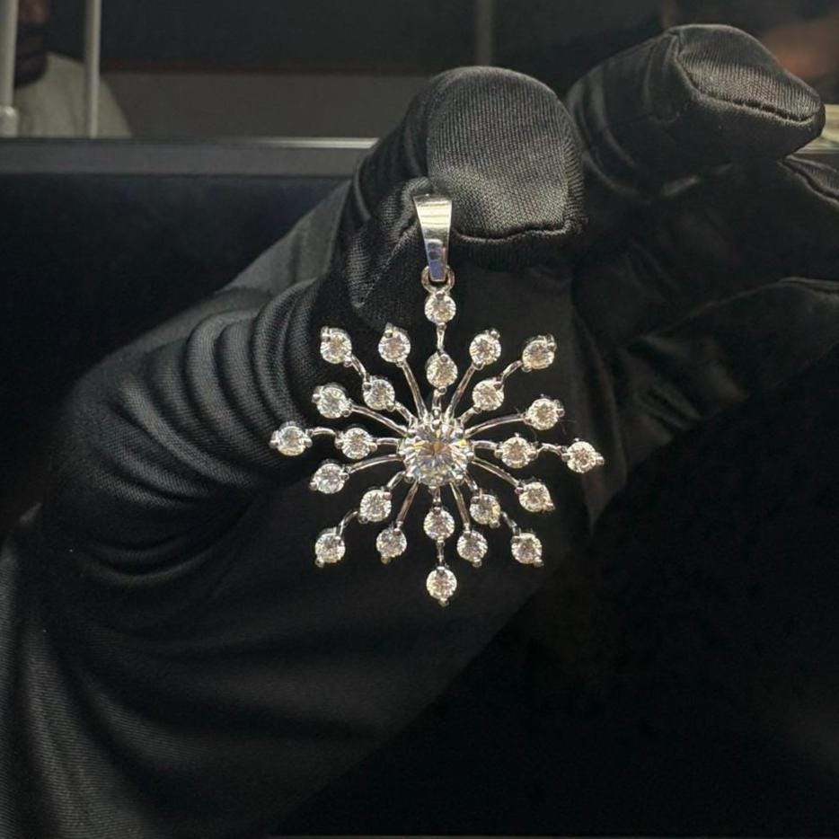 Embrace timeless elegance with our Elegant Snowflake Pendant — a radiant design inspired by the symmetrical beauty of nature’s rarest crystals. Expertly handcrafted in solid sterling silver, this pendant features 25 lab-grown diamonds, including a dazzling 6.5 mm center stone surrounded by 3 mm side stones to create a captivating snowflake burst.